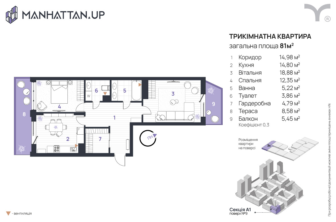 3 кім квартира ЖК Manhattan
